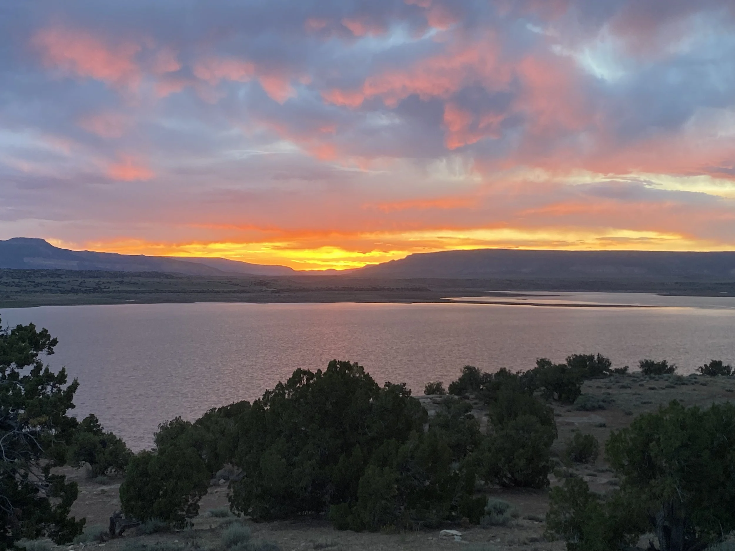 This alternate route to Lake Abiquiu (which was about 35 miles from where we met the Rangers the second time), was absolutely gorgeous! After 10 miles of unpaved roads, we turned onto a section of freshly paved, downhill country road with zero vehicles on it for the entire five mile section, and I felt like I was flying! We eventually hit NM 96, and I rode the rest of the way to Lake Abiquiu staring at the beautiful red rock canyons and mountains that are at least as beautiful as the famous red rocks of Sedona, AZ. We camped at one of Kelly’s favorite campgrounds from her youth, and the sunset over the water was stunning. The end of the day was so much better than the beginning, and I am thankful we were able to turn a negative (getting lost) into one of the best (unplanned) adventures of the trip so far.