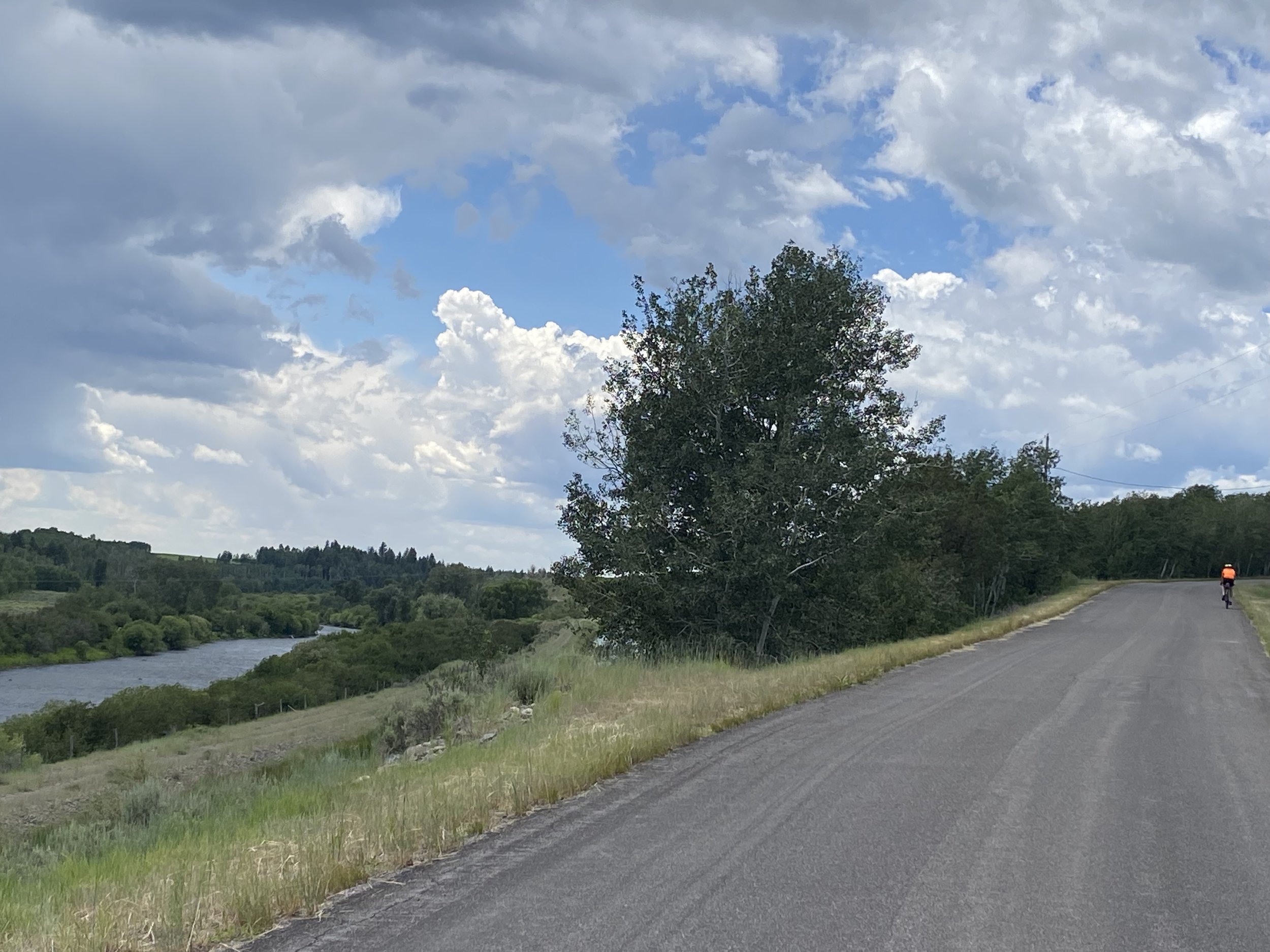 Thoughts from Kelly: I woke up just before 8am feeling fairly rested. I woke Mark up to go with me to pee, since we are now in grizzly country. We haven’t seen any, but many other riders have, without incident. I do not want to take any chances. After slowly getting ready and studying the map for today’s route, Mark decided to save his back, and drive the portion of today’s gravel road. After driving for 20 miles (during this time, we met 3 riders (one from Kalamazoo, about 20 minutes from our home!), we were on pavement and Mark started riding. We were traveling along a river for part of the day, then more mountains and Aspens, so beautiful! I love the way the Aspen trees shimmer in the wind, and make a cool rustling sound. At one point, we went by Warm River campground and saw tons of people tubing that section of the river, having a blast. I was tempted to jump in the river too! We ended up taking the wrong road (Mesa Falls Scenic Byway) to Island Park, but it was a beautiful road with lots to stop and look at. We made it to the main road into Island Park, and a guy told Mark that he can take the two track next to the road all the way into town, since the main road was so busy. Nervous about not finding a place to camp, I drove ahead to scope things out. Luckily, Buffalo Campground had plenty of spots and very friendly people all around us. We walked across the street to Ponds and had our second drinks of the trip. I even got to eat pizza, because they had gluten free crust, YUMMY! After being well fed and taking forever to finish our drinks, we headed back to camp for the night.