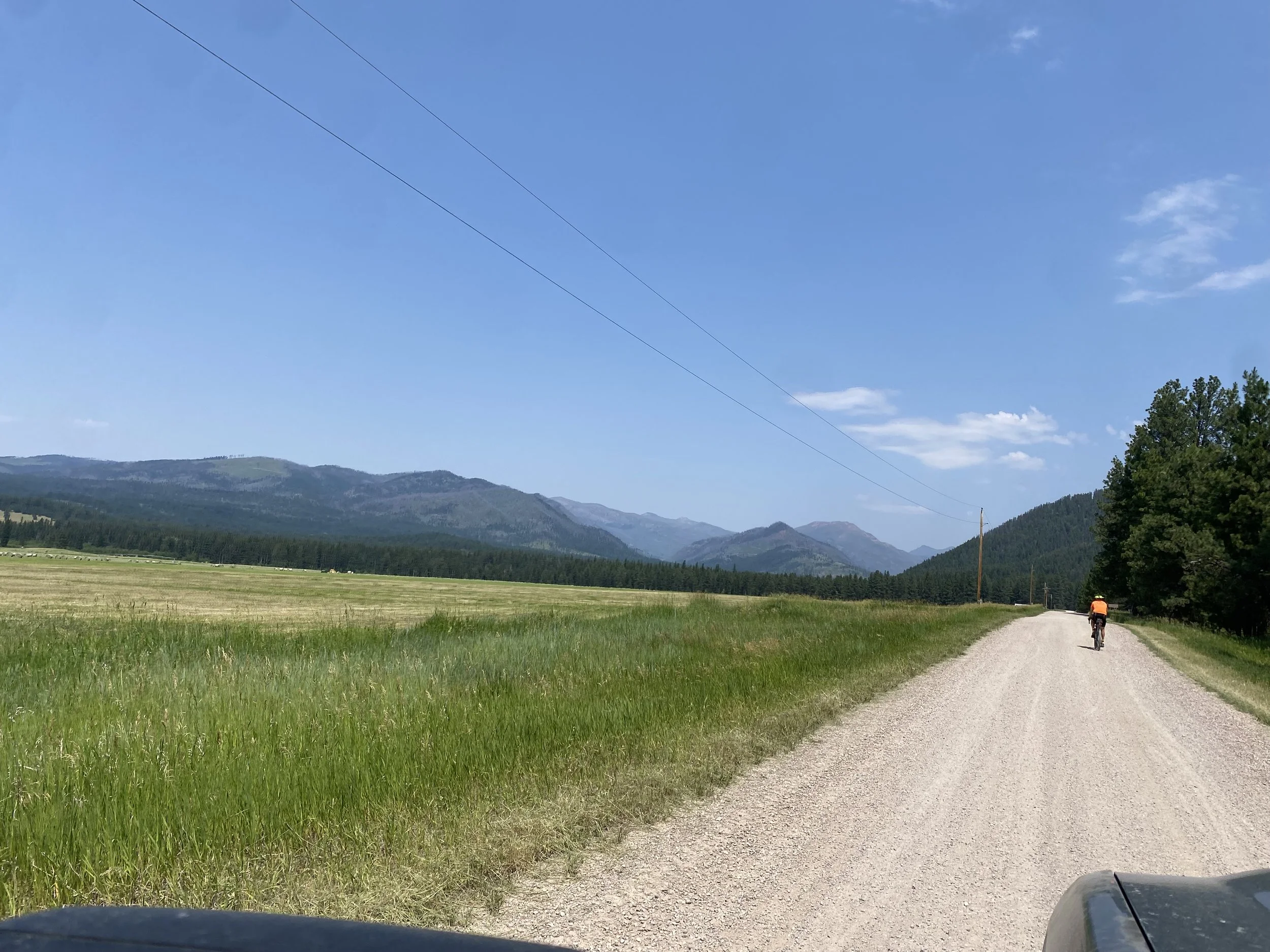 After breakfast, and the extra running around in Ovando, we finally hit the road, and got some miles in. We eventually ended up in Seeley Lake, where we stopped for a break, and I had a restaurant meal (a very yummy burrito), while Kelly didn’t feel like eating restaurant food. The town definitely had a “touristy vibe,” and we didn’t really hang out for very long. This deadline of needing to leave Banff by July 20th or 21st is starting to make me feel like we can’t fiddle-fart around. I decided to ride on MT 83, which is a pretty busy highway with lots of semi trucks, and very little shoulder (in spots). It was nice pavement, and I was able to ride fairly fast, which helped ease some of my anxiety about not having enough time to finish the ride. We stopped in Condon, a small town with a combination grocery store, rental cabins, lawn camping, showers, and laundry. We got there just as the woman running the grocery store was closing for the night, but she let Kelly come in, and pay for camping. There were several other cyclists camping there, and we had a nice chat.